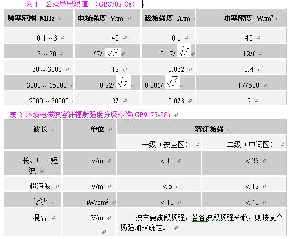 在對一般環(huán)境的電磁輻射分析中,應(yīng)主要選用《環(huán)境電磁波衛(wèi)生標(biāo)準(zhǔn)》主要選用《環(huán)境電磁波衛(wèi)生標(biāo)準(zhǔn)》(GB9175-88),根據(jù)輻射源的主要輻射頻率,參照表2,找到其輻射強度限值。注意掌握三個標(biāo)準(zhǔn)限值,一般我們把居民居住的環(huán)境按一級安全區(qū)處理,則其標(biāo)準(zhǔn)限值為:在長、中、短波,電場強度應(yīng)小于10V/m;在超短波段,電場強度應(yīng)小于5V/m;在微波波段,其輻射功率密度應(yīng)小于10μW/cm2。考慮到對在電磁輻射環(huán)境內(nèi)工作人員的保護,我們建議在職業(yè)安全衛(wèi)生領(lǐng)域,采用《電磁輻射防護規(guī)定》(GB8702-88)的相應(yīng)限值。